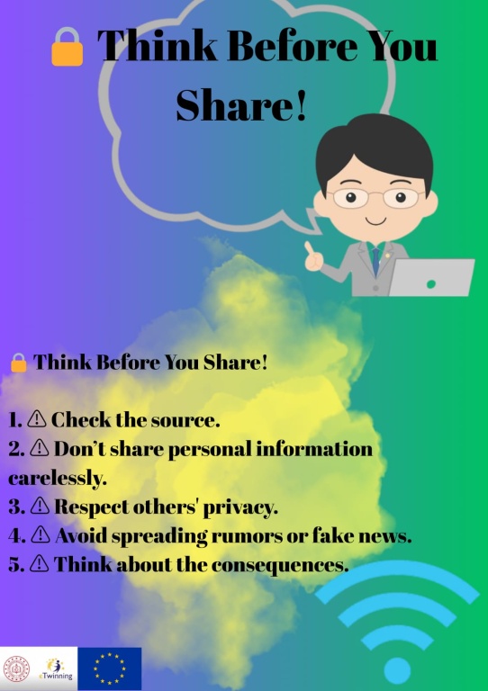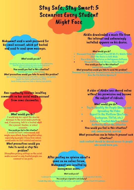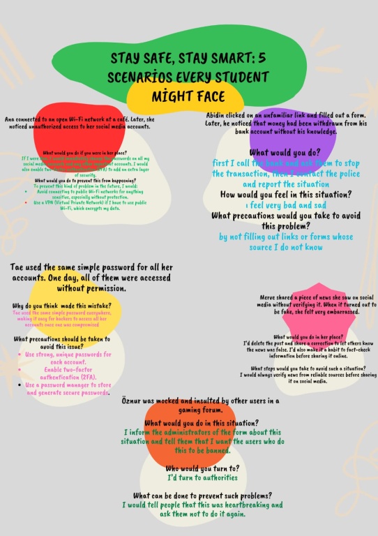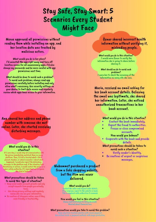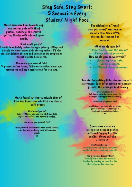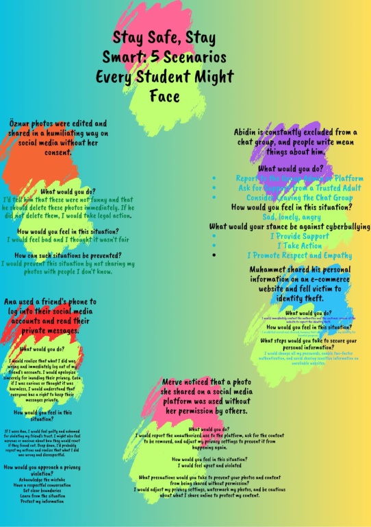 Proje süresince çeşitli etkinlikler gerçekleştirilmiş; bilgilendirici sunumlar, interaktif çalışmalar, dijital güvenlik uygulamaları ve çevrim içi tartışma oturumları düzenlenmiştir. Ayrıca öğrencilerimizle birlikte hazırlanan afiş, broşür ve dijital içeriklerle konular pekiştirilmiş; yapılan tüm çalışmalar sürece aktif katılımı desteklemiştir.