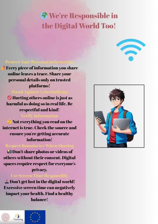 Projemiz, öğrencilerimizin dijital çağın gereklerine uygun şekilde; bilinçli, sorumluluk sahibi, etik değerlere bağlı ve güvenli dijital bireyler olarak yetişmelerini amaçlamıştır. Bu doğrultuda, öğrencilerimizin çevrimiçi hak ve sorumluluklarını öğrenmeleri, siber zorbalık, bilgi mahremiyeti ve dijital ayak izi gibi konularda farkındalık kazanmaları; ayrıca dijital ortamda karşılaşabilecekleri sorunlarla başa çıkma becerilerini geliştirmeleri hedeflenmiştir.
